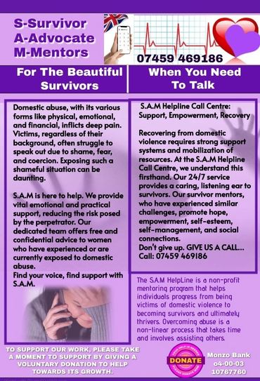 At Survivor Advocate Mentors (S.A.M) Empowerment and Recovery Helpline for Women, we understand the challenges and emotional turmoil that come with recovering from domestic violence, we have been there. Our mission is to provide unwavering support, empowerment, and guidance to help you rebuild your life with confidence and strength. by abusers. Our dedicated team offers free and confidential advice to women, empowering them to reclaim their lives.